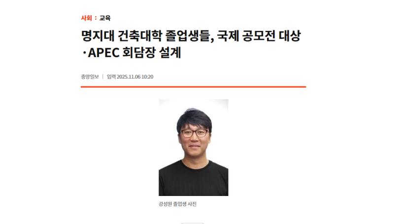 명지대 건축대학 졸업생들, 국제 공모전 대상·APEC 회담장 설계 소식 중앙일보 기사입니다.
