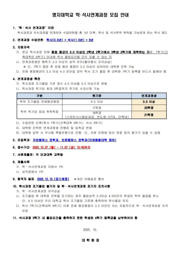 2025학년도 2학기 학·석사연계과정 모집 안내