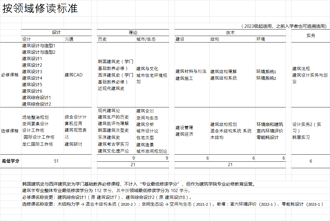 建筑学专业教养课程选择及修读标准
